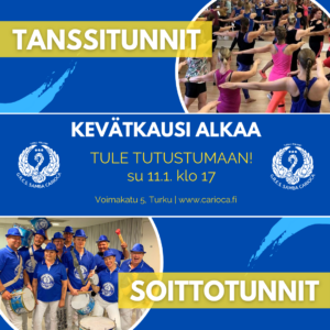 Samba Cariocan kevätlukukausi alkaa sunnuntaina 11.1. klo 17.00. Kausi aloitetaan perinteisellä kaikille ilmaisella tutustumistunnilla. Tunnille tarvitset mukaan ainoastaan tanssimiseen soveltuvat...